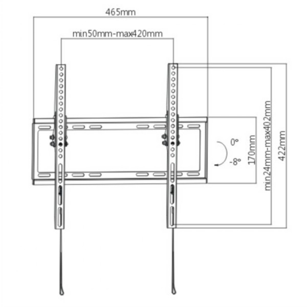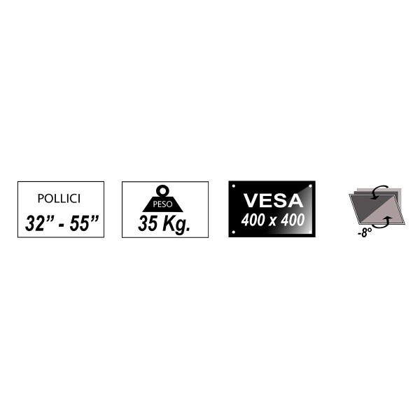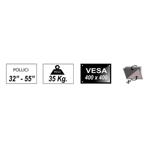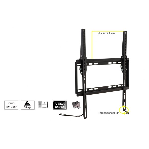 SUPPORTO A MURO PER TV LED, LCD, PIATTE, DA 32 A 55''.Design ultra slim, sporge solo 2 cm dal muro e quindi si adatta allo stile delle TV ultrasottili.Permette l'orientamento verticale del video e lo spostamento laterale quindi è semplice posizionare il video esattamente dove si desidera.Design aperto, che massimizza il flusso di aria per areare il video e fornire un comodo accesso al retro della TV.Supporta fino a 35 kg. In acciaio, offre un'ottima resistenza.Dimensione prodotto: 465X422X20.5mm Per standard VESA: 200x200,400x200,300x300,400x400, 400x300 Orientamento verticale: .0° / -8°.Viti e tasselli inclusi.